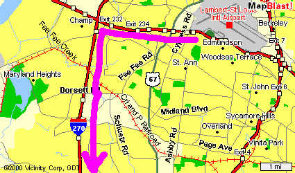 From Lambert Airport in St. Louis, West on I-70, approx 3 mi to I-270, South (left) on I-270, approx 15 mi to I-55