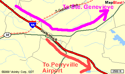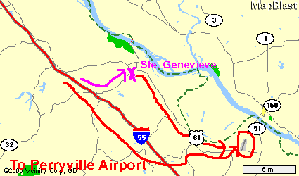 It should take approximately 1-1/4 hrs to drive from Lambert Airport to Ste. Genevieve. It should take approximately 1-3/4 hrs to drive from Lambert Airport to Perryville airport. Call us at (314) 540-0367 if you need further local directions.