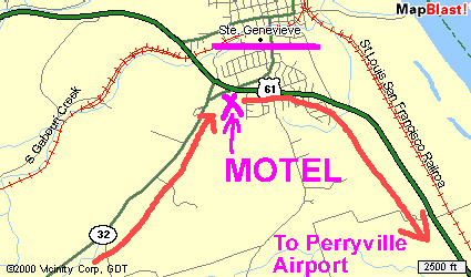 We live in historic Ste. Genevieve Mo., about 20 miles north of the Perryville airport. We have arranged special room rates at the Microtel Inn in Ste. Genevieve Mo. Ste. Genevieve is a small town on the Mississippi River also.